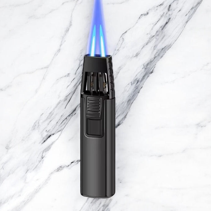 This lightweight, pocket-sized twin jet flame lighter combines sleek design with satisfying functionality. Its rounded-off rectangular shape ensures a comfortable grip, while the pull-down ignition lever delivers a crisp, satisfying click.